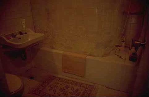 (b) 緊接著進入文化中心建築物內,以酒精塗抹(戲謔的模仿繪畫方式!)並點燃一件由12塊100F白色畫布所成型之立體三角錐狀物,使其燃生藍色火焰;直到全體通透為止.