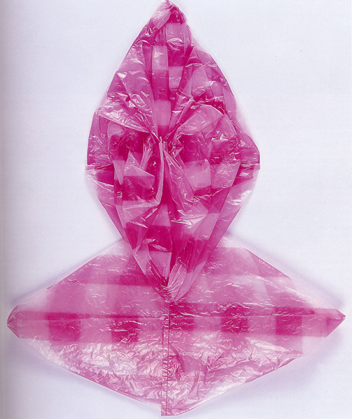 從1990年以來,我就開始使用塑膠袋作為創作素材,原本是把它當成作品的背景材料,後來慢慢地演變成為主題。塑膠袋令我沉迷之處在於它總散發出一種無可取代的真實感,我的塑膠袋影像作品常被人誤以為是現成物的裱貼,後來經過提示,觀者才會發現自己眼睛被騙了,但我的目的不是要騙人眼睛,而是塑膠袋本身即具有一種特殊的真實感,我就是沉迷在這種真實感之中。另一方面,我覺得真正的藝術是來自真實但卻乏味的的生活之中。塑膠袋即生活最底層的產物;也是生活的象徵,我有一種想在廉價、平凡生活中創造奇蹟的願望,這樣的願望和買樂透彩券或宗教上的“顯靈”現象在精神上是一致的,因為一絲奇想和願望是支撐我(們)能苟活下去的最重要因素。我喜歡如巫術般賦予平淡無奇的塑膠袋一種崇高的形象,來達成、滿足這種自我的願望。