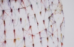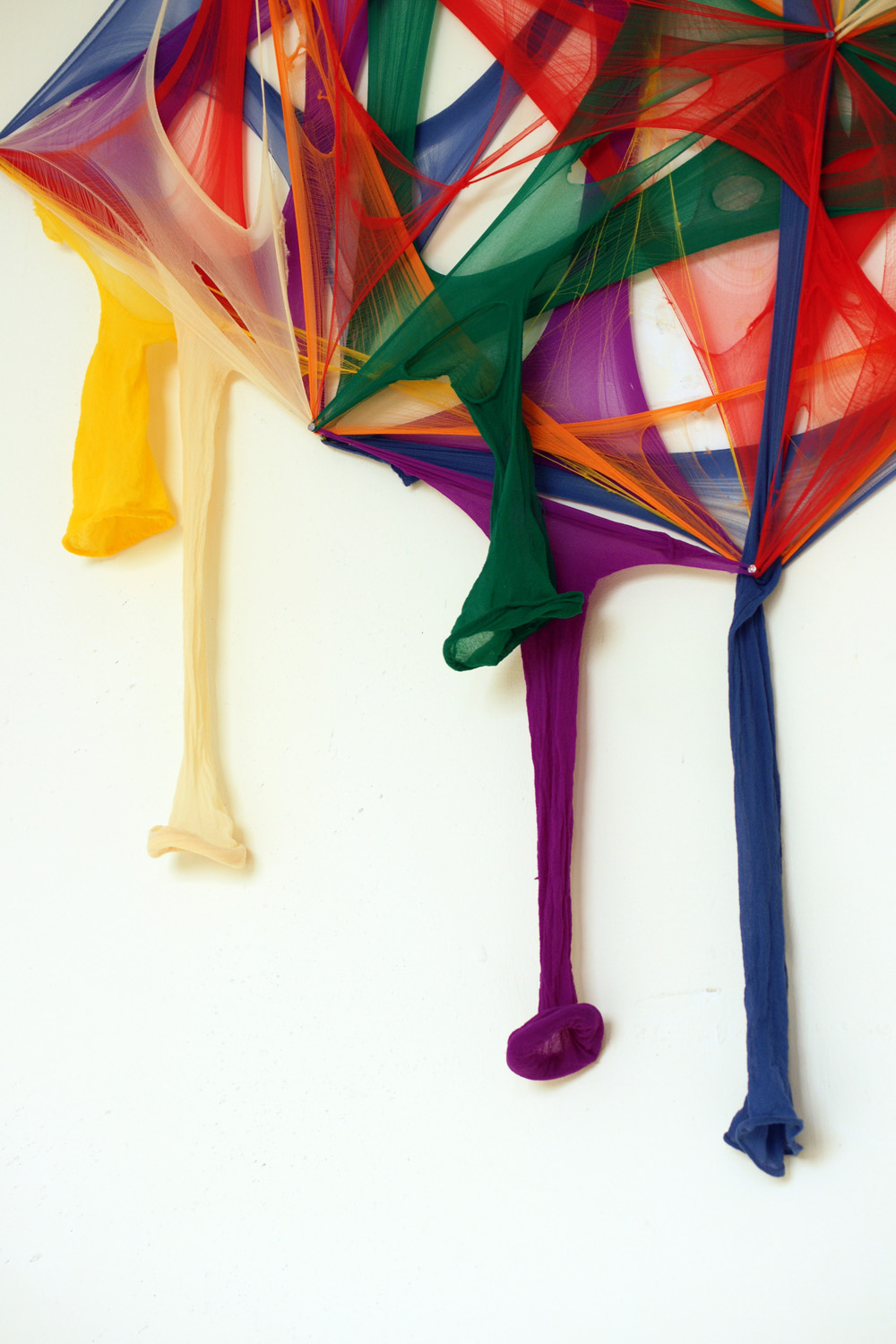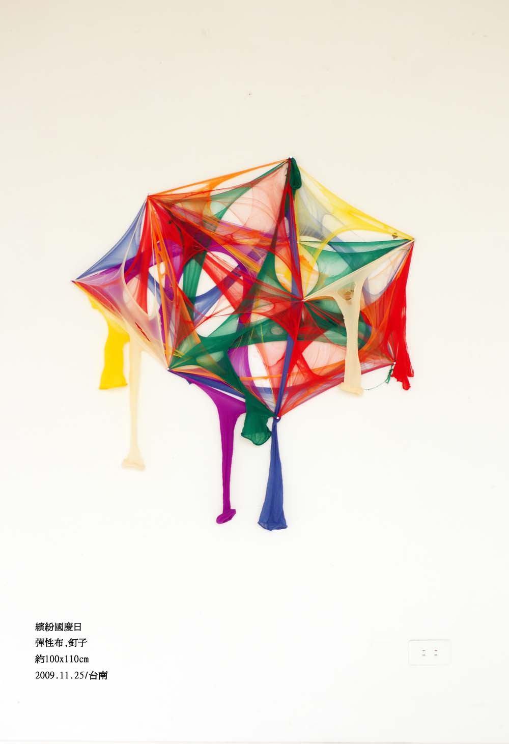 跳脫了絲襪做為某種人造纖維材質具有的彈性、細緻、包覆、透出的視覺挑逗與膚觸感,代之以緊繃、斷裂、鬆弛的線性質感,以此不斷循環的三個步驟,冷靜的水平與垂直勾勒了這個世界的外觀。