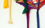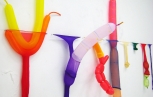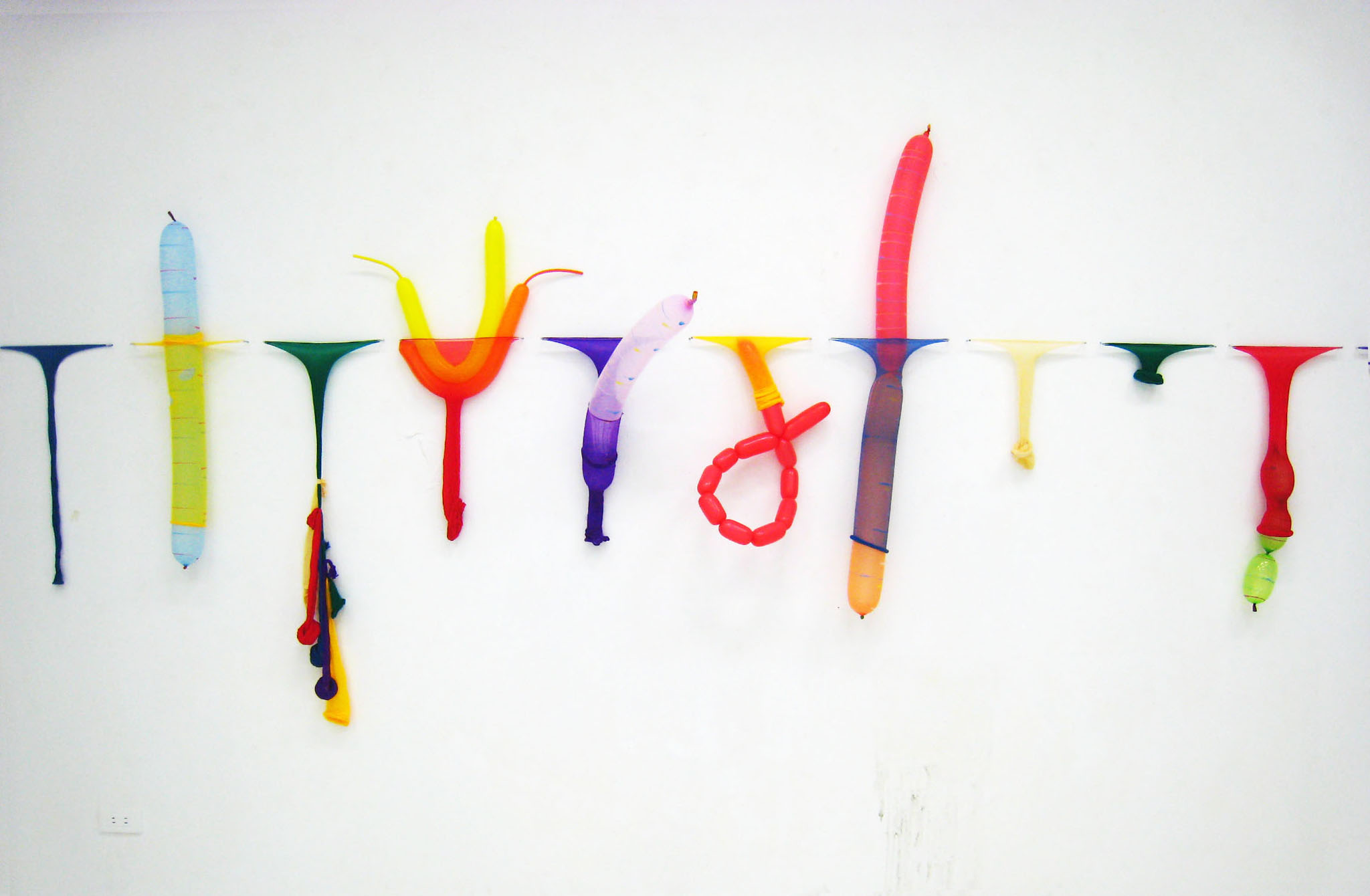 在絲襪纖維與氣球不斷相互摩挲、糾結,直至取得各式不同的造形平衡之前,那粉橘色、螢光綠、桃紅、粉紫,糾纏得像毛蟲的絲襪材料被整把地拉到地上,經過反覆打氣的身體勞動,這些宛如不知名物的動物肢體、或有機物造形的各種類身體樣態成了勞動後應允的彩色成果。