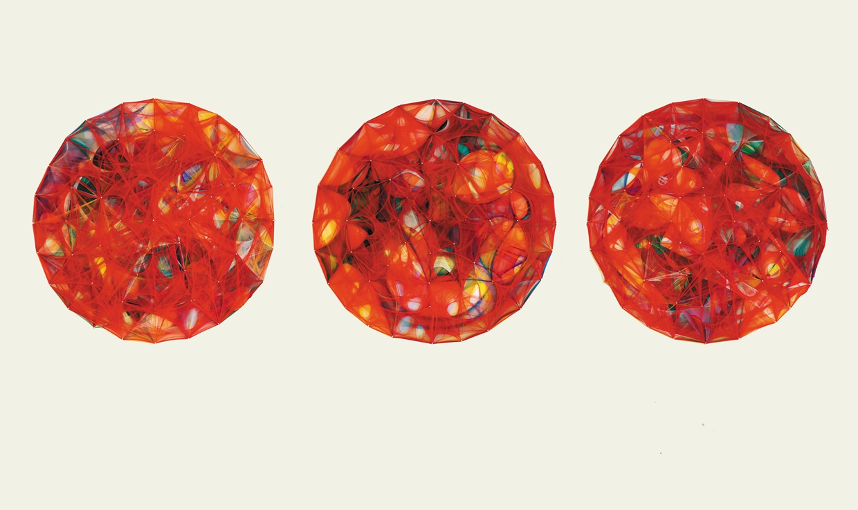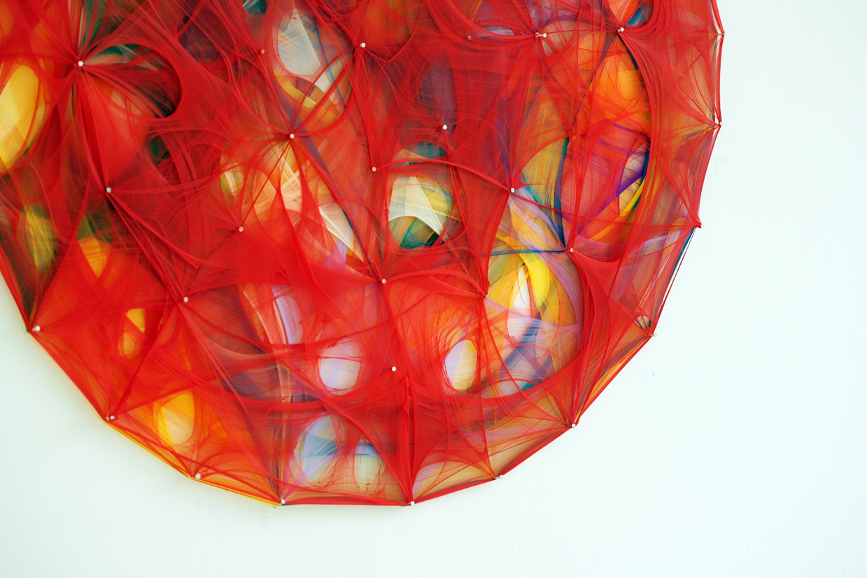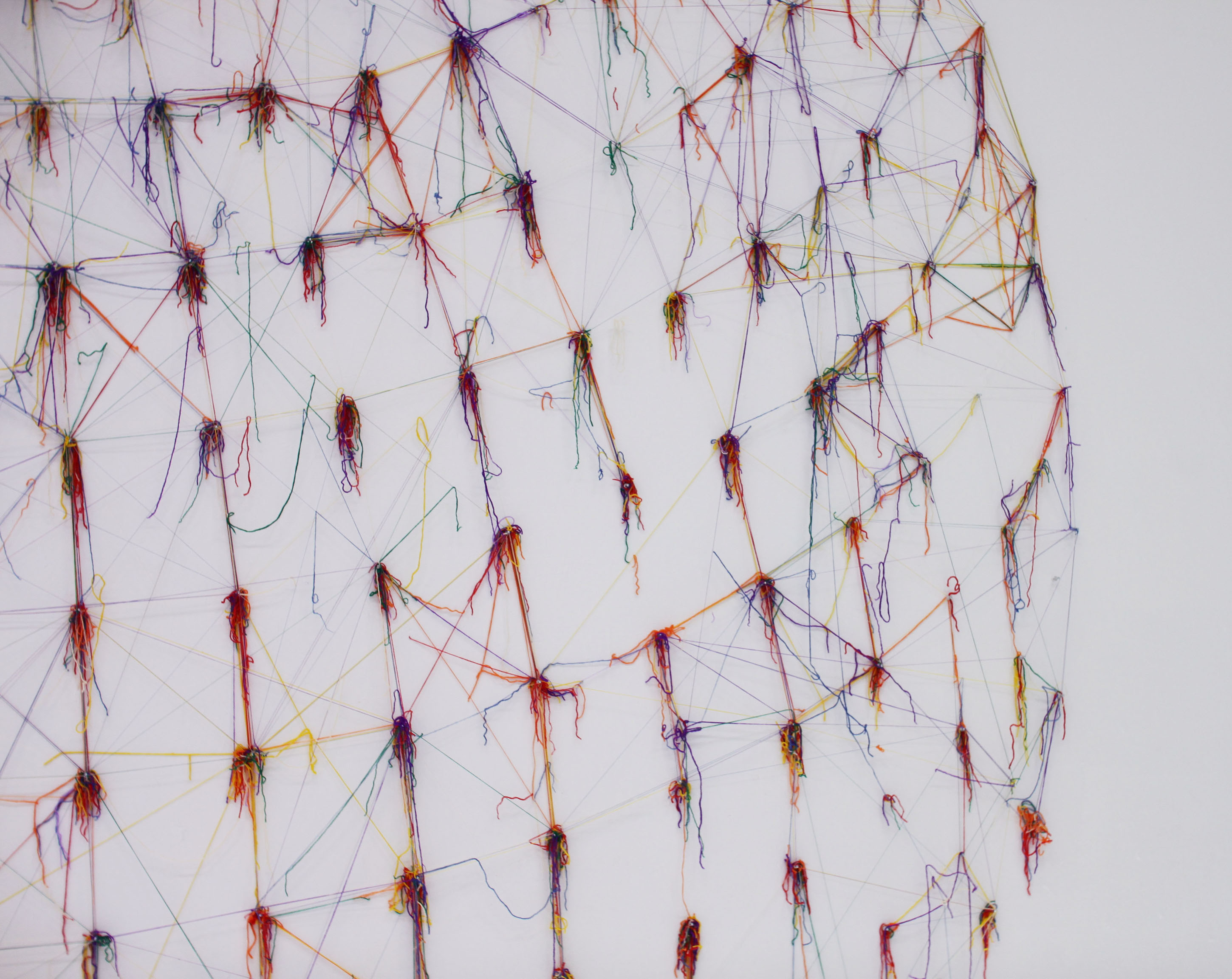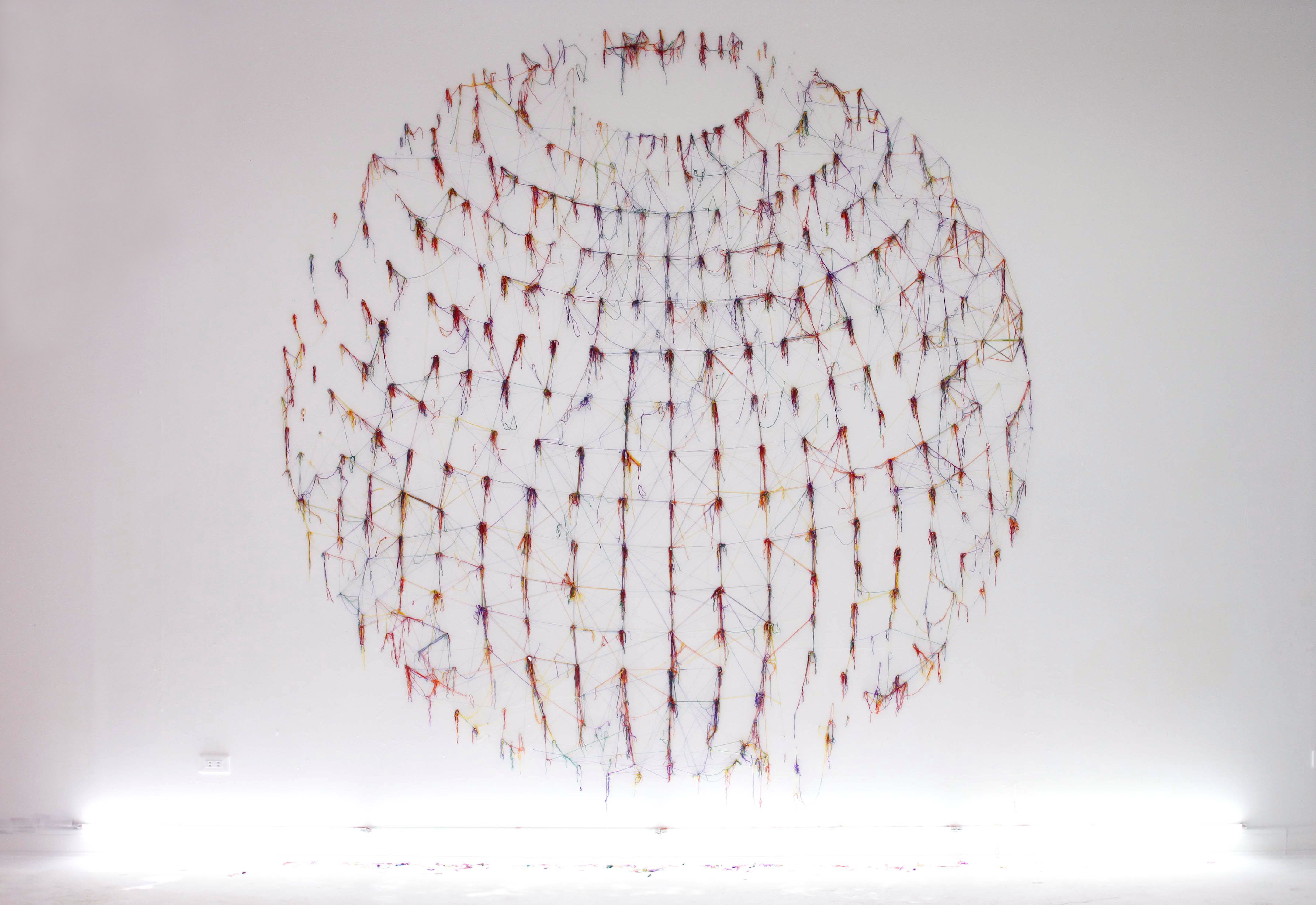 做為計畫性的作品行動,每一個創作當下的身體感知與情緒狀態,成為破壞看似平靜的狀態的指導原則,繃緊的線條堅持在點與點之間,突遭截斷後吊掛在點上,有些就墜落在下方刺眼的光源上。那是經緯交錯點,也是支撐住世界樣態的支點。
